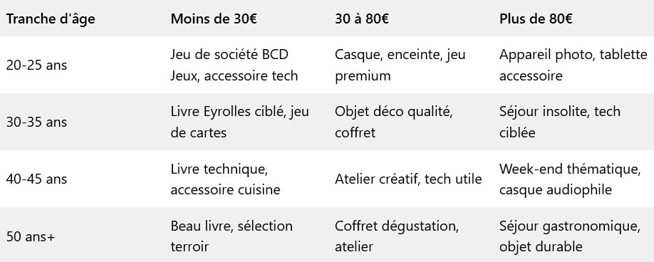 Ce guide part d’un principe différent. Plutôt que de lister 50 idées dans le désordre, on organise par âge et par profil — parce qu’une femme de 24 ans et une femme de 52 ans n’ont pas les mêmes attentes, même si elles partagent les mêmes passions.