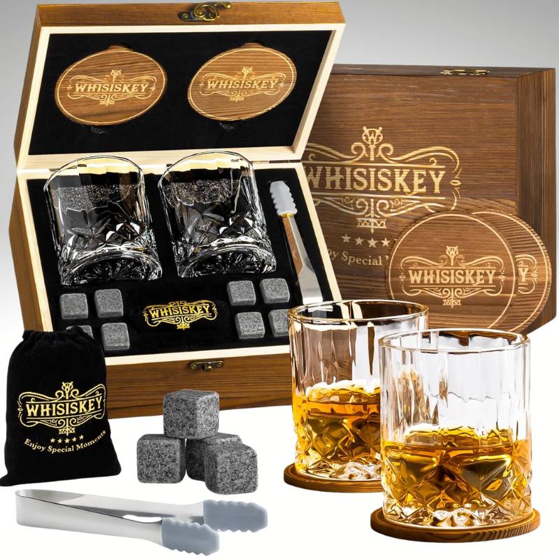 Set Verre à Whisky & Spiritueux – 8 Pierres à Whisky – 4 sous-Verres + accessoires